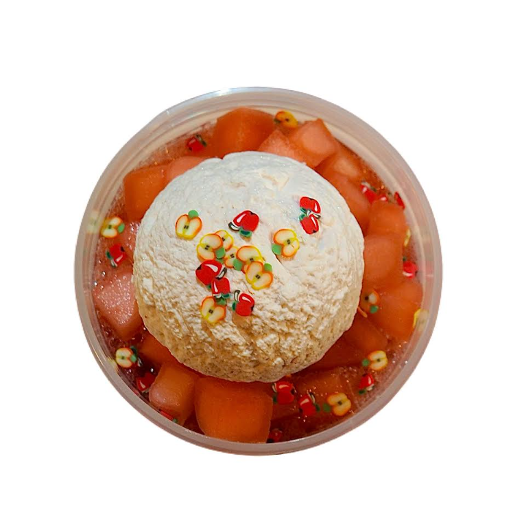 Texture: This has a crunchy snow fizz on the bottom to look like a crust, and a clear jelly cube slime on top, that looks like apple pie filling. And it makes great popping noises when you squish the jelly cubes.